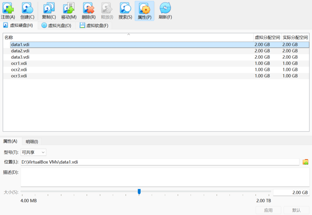 命令执行完毕后,就可在 VirtualBox 的虚拟硬盘中看到刚才创建的共享盘。