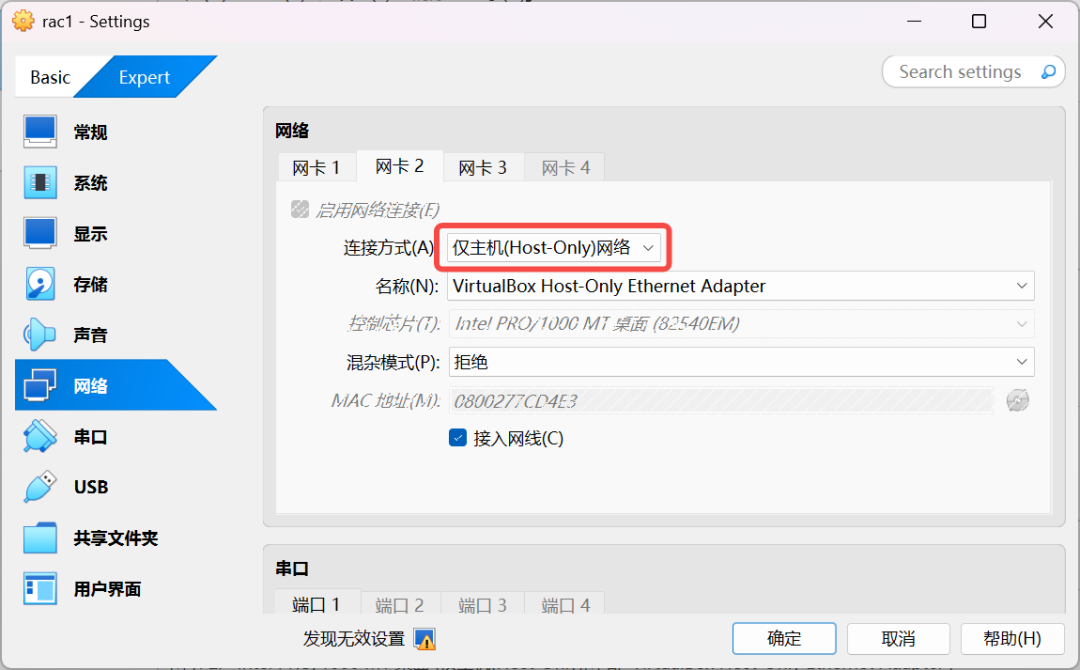 注意:如果无法访问虚拟机,可将第二块网卡从桥接模式修改为 Host-Only 模式。