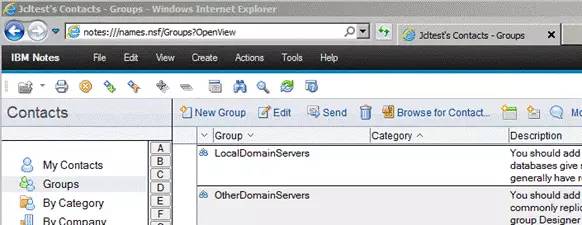 如果您希望直接打开某个 Notes 数据库的视图,那么您也可以在浏览器中通过 URL 的方式来打开。以打开联系人数据库中的分组视图为例 , 您可以在浏览器的地址栏输入这个 URL – notes:///names.nsf/Groups?OpenView,即可打开联系人的分组视图(如图 13.)。