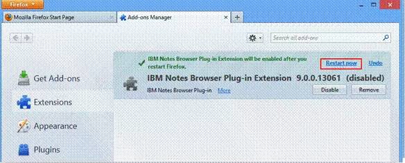 在(图 5.)所示的界面中点击“Restart now”,浏览器自动重启后,Notes Browser Plug-in 的插件才被真正启用