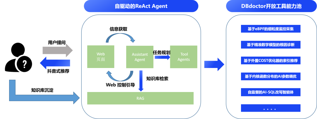 Tool Agent(执行官):专司与DBdoctor开放能力池交互,灵活调用各项数据库诊断、优化工具服务,将指令转化为行动。