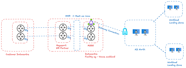 在这种架构中,客户只需将其本地数据中心与运营商网络连接,而运营商负责将网络延伸至微软的对等互联节点。例如,客户可以选择 全球 NaaS 提供商(例如Megaport)或本地电信服务商,将数据从本地路由到 Megaport 的设备,再由 Megaport 在目标数据中心完成与微软设备之间的物理交叉连接。