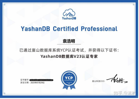 通过YCP认证考试,我不仅验证了自己的学习成果,还获得了YashanDB官方认证专家证书,这对我未来的职业发展具有重要意义。YCP证书不仅代表了我具备YashanDB高级运维和管理能力,也意味着我在国产数据库领域迈出了坚实一步。