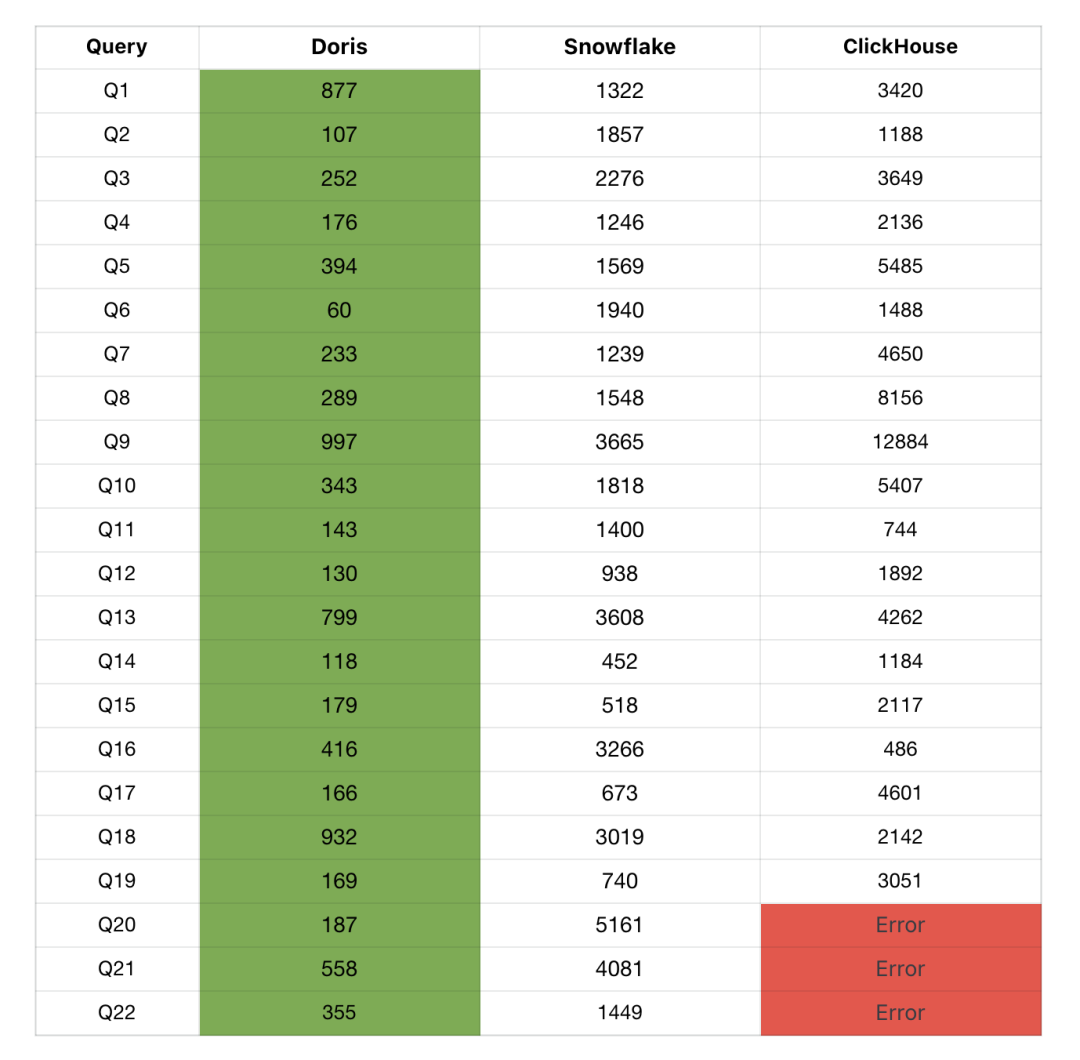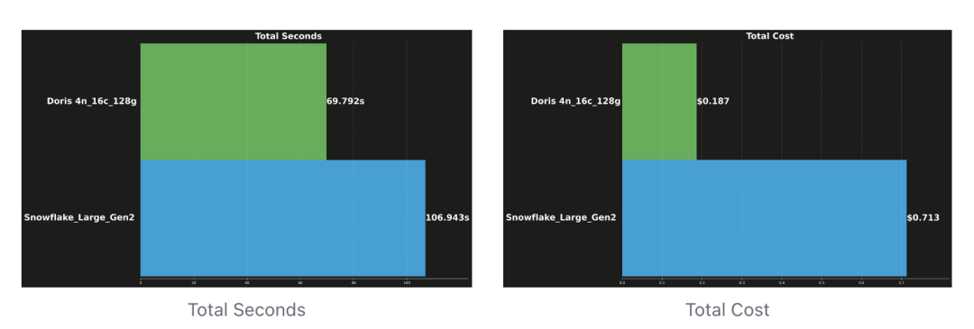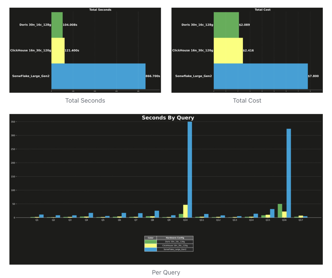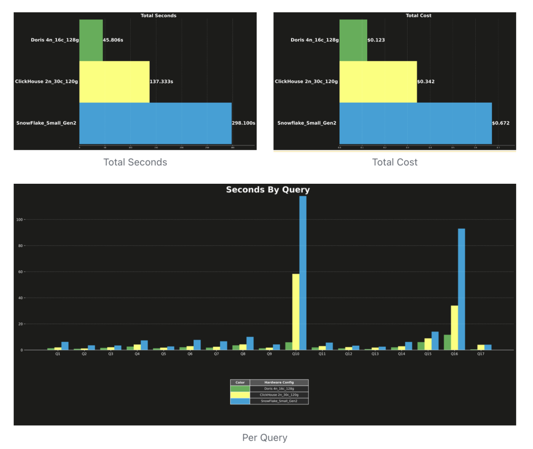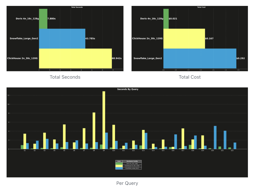 在 SF100 的 规模下,以总运行时间作为指标,Doris 比 Snowflake 快 6 倍,比 ClickHouse 快 14 倍(由于 Q19-22 ClickHouse 存在无法执行的情况,所以在总时长计算时,按照 0 来处理)。大多数查询 Doris 都轻松在 0.5 秒内跑完,无论是对于 Snowflake,ClickHouse 都能快上 5 到 10 倍。反观 ClickHouse,不仅无法完整跑完 22 个 TPCH 的查询,仅仅看它够完成的查询中,耗时也是三个产品之中最高的(ClickHouse 的测试是基于 ClickHouse Cloud 云上的 25.4 的版本,SQL 语句来自于官方改写后的 SQL:https://ClickHouse.com/docs/getting-started/example-datasets/tpch)。在成本上,与 Snowflake 相比,Doris 仅需 10 分之一的价格,跑出了快于 Snowflake 5 倍的性能表现,体现了 50 倍的性价比。