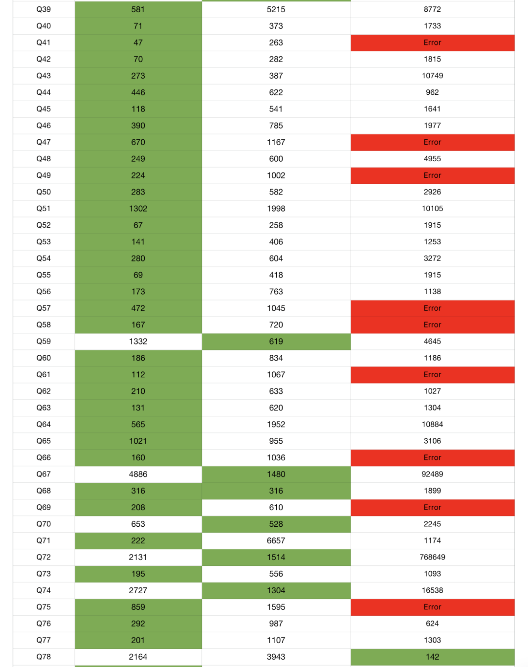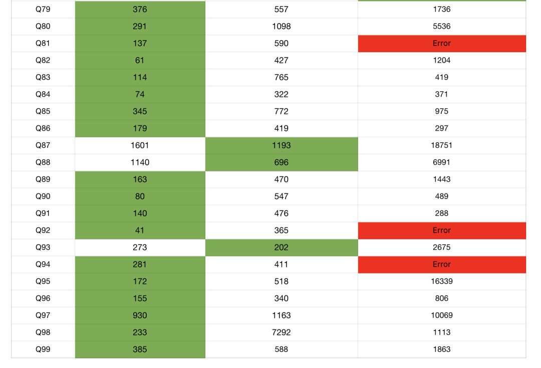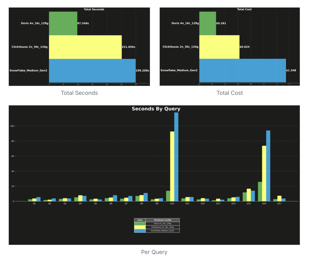 在 14 亿行数据的规模下,Doris 的查询性能比 ClickHouse 快了 2.5 倍,比 Snowflake 快 3 倍。在这个测试中,Snowflake 使用了 Medium 配置,所以在总成本略有上升,Snowflake 的成本是 Doris 的 5 倍。ClickHouse 的成本仍然是 Doris 的 2.5 倍。从单条语句的查询性能上看,17 条查询中有 16 条 Doris 都是最快的。