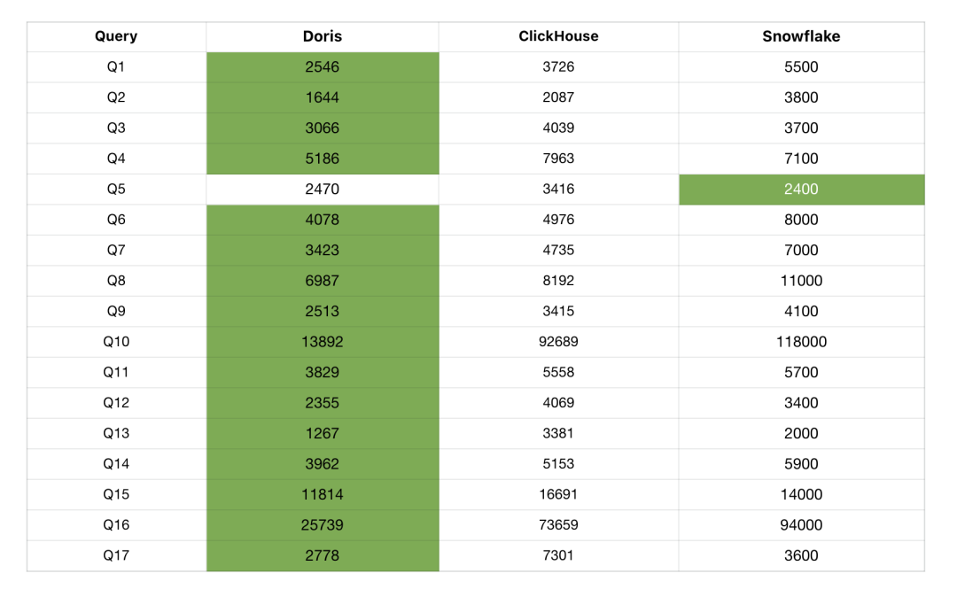 在 72 亿行数据的规模下,比 ClickHouse 略快一点,比 Snowflake 快 8 倍。 通过分析数据发现,实际是 Q16 显著的拖慢整体的查询的耗时(对于这个查询我们也发现了一个 Apache Doris 正在进行的关于数据倾斜的优化点),如果剔除它,Doris 的性能表现依旧是 2 倍领先 ClickHouse,17 条查询中有 14 条 Doris 是最快的,所以 Doris 依然是又快又省的最佳选择。