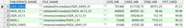 free_mb:已经分配给oracle数据文件,尚未被数据库对象(表、索引)占用的空间。这些空间可以直接用来存储新数据或扩展现有对象,不需要向操作系统申请新的文件系统空间。现在还有89751M没有使用