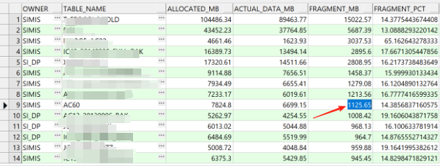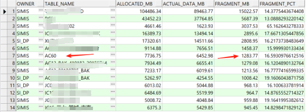 -- 需关注 size_mb 大但是 pct_used 低的表空间。这些表空间实际使用率不高,是收缩的目标。