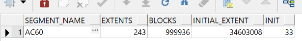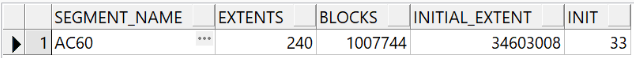 select SEGMENT_NAME,EXTENTS,BLOCKS,INITIAL_EXTENT,INITIAL_EXTENT/1024/1024 init from DBA_segments where owner='SIMIS' and SEGMENT_NAME='AC60';
