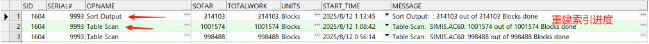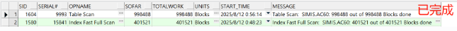 SELECT sid, serial#, opname, sofar, totalwork, units ,start_time,message