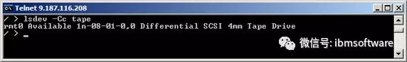 图 5. 在 AIX 命令提示符中键入 “lsdev -Cc tape”