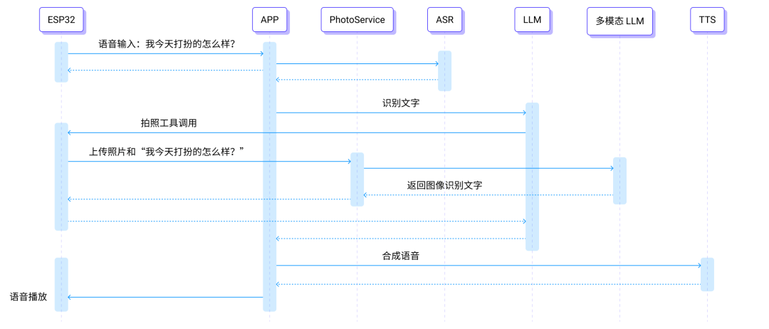 实时图像采集:智能体解析用户指令,调用 ESP32 摄像头捕捉画面并上传至云端多模态 LLM。