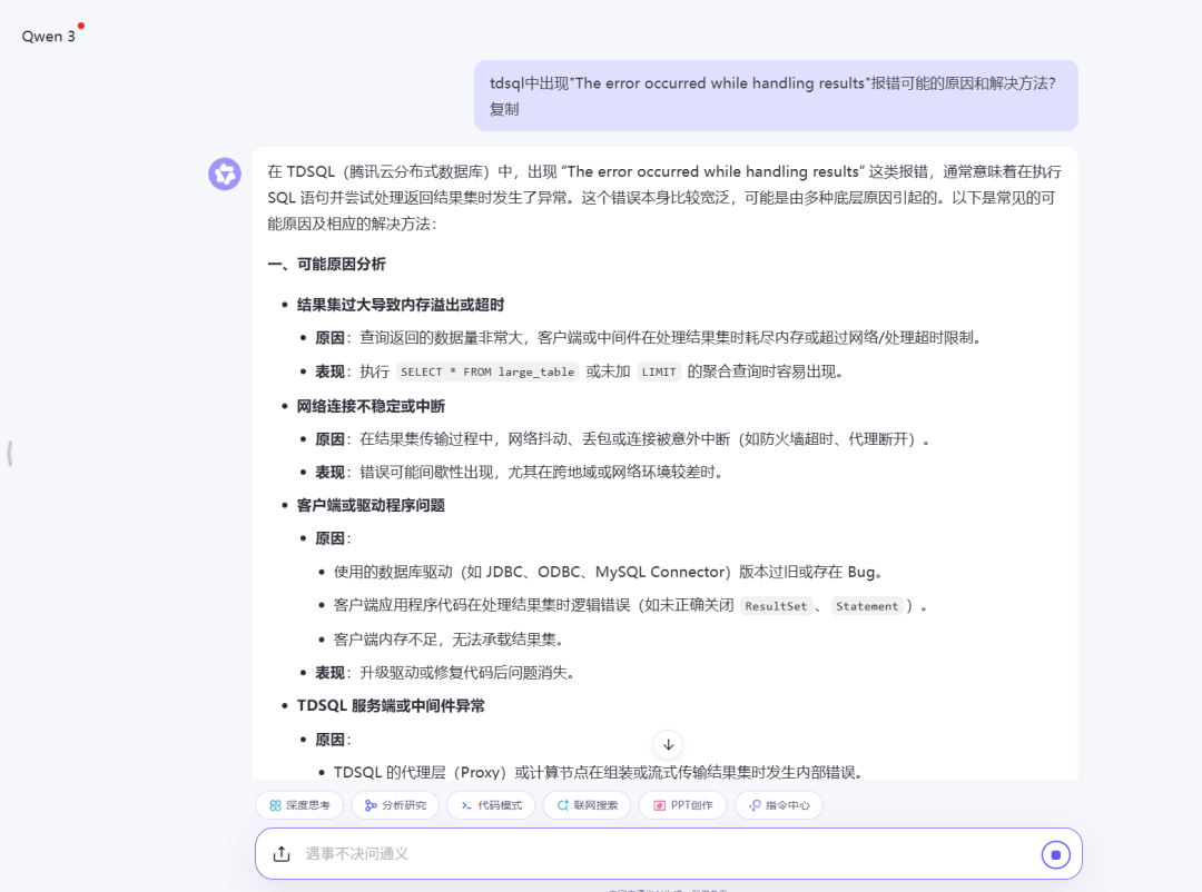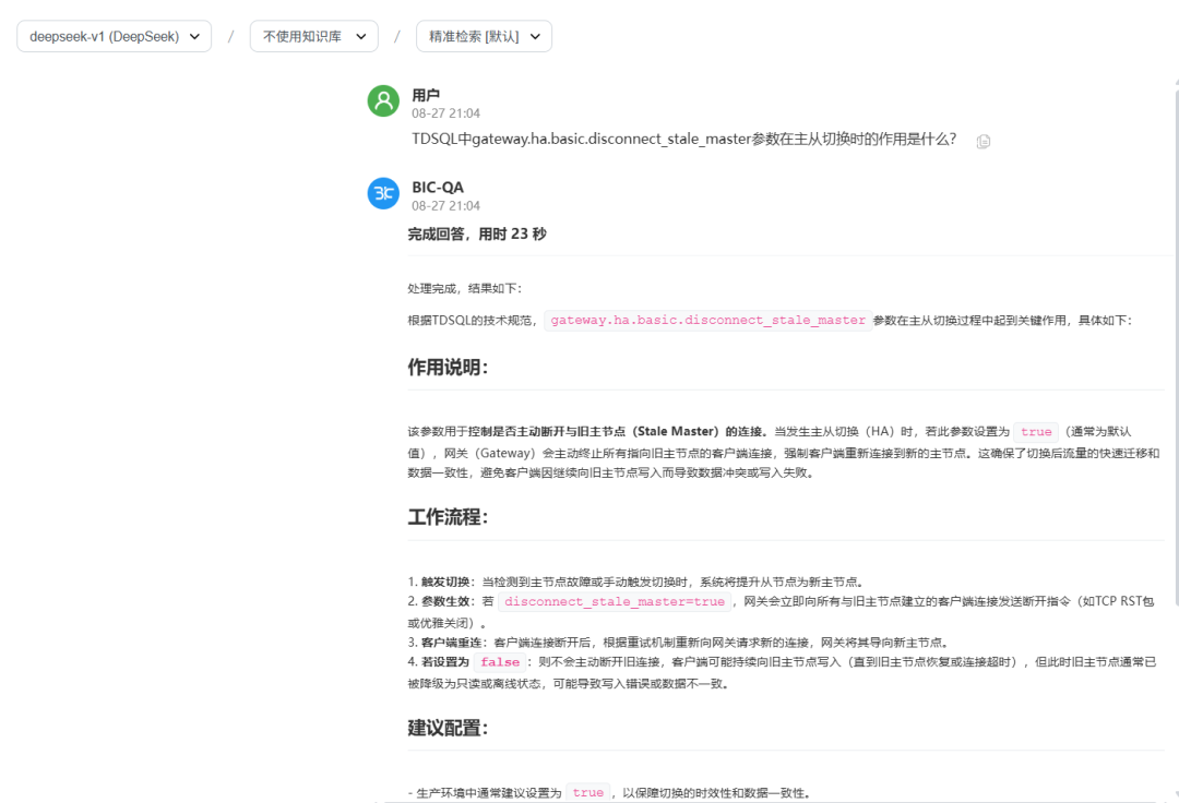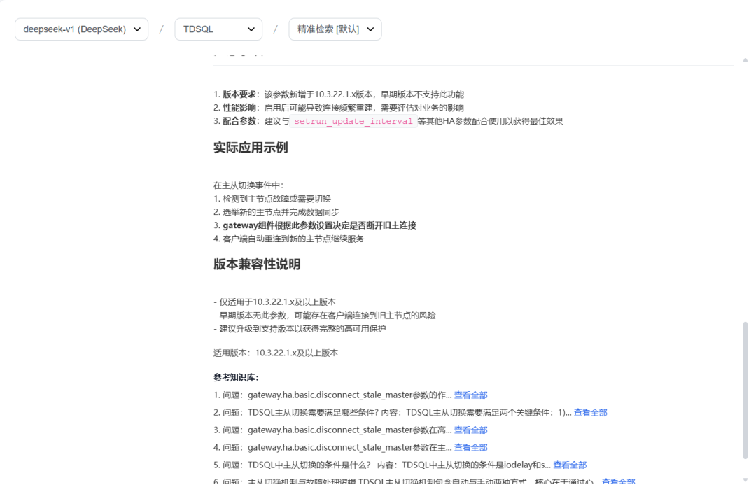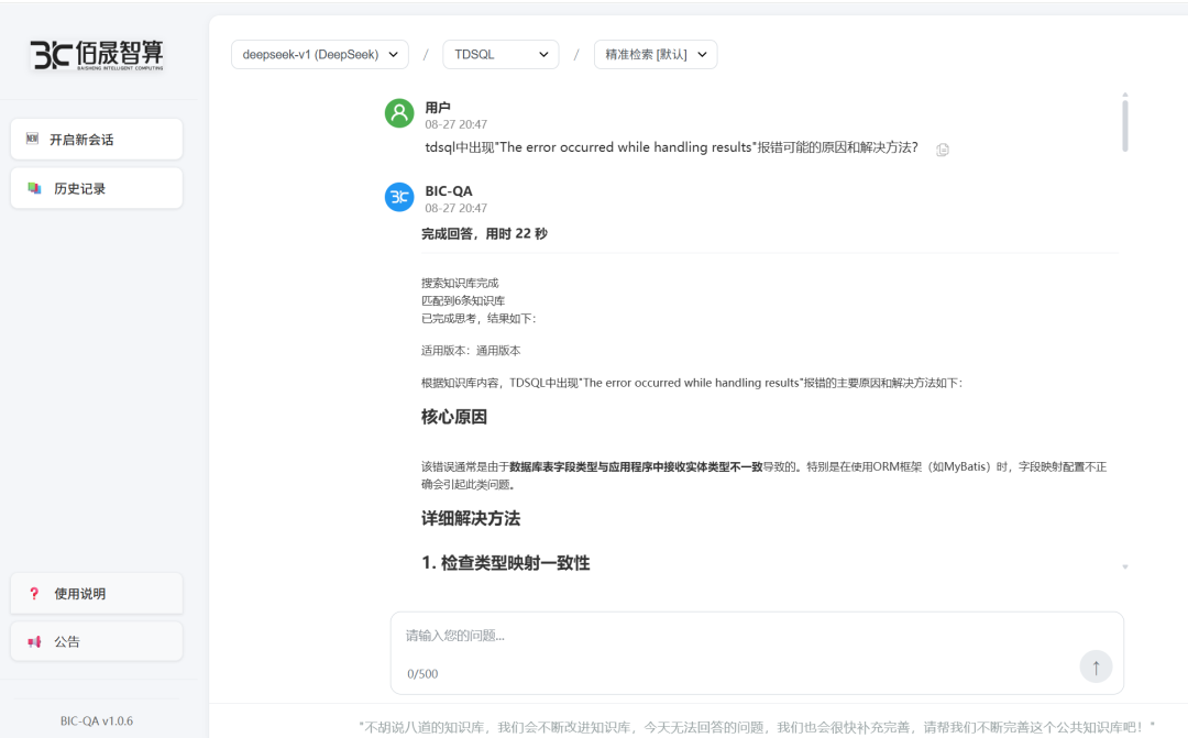 在DTCC期间,腾讯云数据库团队与佰晟智算两个深圳的团队在北京完成了一次异地交流,大家达成的一项合作就是共建国产数据库知识库。从DTCC回来后,腾讯云数据库的同学就十分积极地与我们开始了协同工作,将目前TDSQL最新的文档资料整理后交给佰晟智算进行处理。今天这项合作的第一个成果已经上线了,在BIC-QA的官方网站上已经上线了第一个TDSQL知识库-TDSQL官方文档知识问答。 因为在BIC-QA中已经预留了TDSQL的编码-2201,因此目前在使用BIC-QA 1.0.6版本的用户无需任何升级,就可以在知识库中选择TDSQL,然后对知识库发起提问了。 对于“出现"The error occurred while handling results"报错可能的原因和解决方法?”这个问题,如果选择了知识库,可以十分明确地找到TDSQL的官方答案,因为数据库表字段与应用程序中接收实体的类型不一致导致了这个问题,很可能是在ORM框架中配置存在问题导致了错误的发生。如果不使用知识库,直接问deepseek,结果则截然不同。 可以看出,直接询问deepseek,得到的回答是驴唇不对马嘴的。国产数据库的知识,目前在国内外大语言模型都比较缺乏,因此回答错误的概率很高,通过专业知识库去寻找答案还是十分有必要的。 针对这个问题,如果去问满血的 QWEN3,答案依然是错误的。我们再换一个问题:“gateway.ha.basic.disconnect_stale_master参数在主从切换时的作用?”,看看BIC-QA的效果如何: 命中了知识库,回答还是有理有据的。下面我们关闭知识库,仅用deepseek来回答这个问题: 很幸运,这回deepseek能够回答这个问题,不过从回答问题的细节与质量上看,使用了知识库的效果更好。从上面这两个例子可以看出,在使用完全相同的提示词的情况下,在知识库的帮助下,TDSQL知识问答的质量有了相当明显的提升。 目前我们已经开源了访问国产数据库知识库的代码,有兴趣的朋友可以去https://gitee.com/BIC-QA/bic-qa/releases/tag/v1.0.6 下载BIC-QA最新版的浏览器插件,安装在chrome内核的浏览器(比如EDGE等)中直接使用。也可以到https://gitee.com/BIC-QA/bic-qa 去下载源码,自己定制相关的版本。我们选择了比较宽松的APACHE协议,允许任何人去做裁剪和定制,甚至直接免费调用我们的API接口。 我们和腾讯云数据库的合作会继续深入,未来TDSQL的知识库也会陆续上新一些高质量的运维经验。目前API服务还是放在我们的服务器上,今后也可能会迁移到腾讯云上去,更好地为大家提供服务。