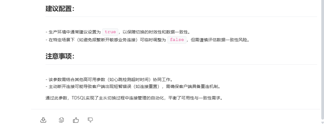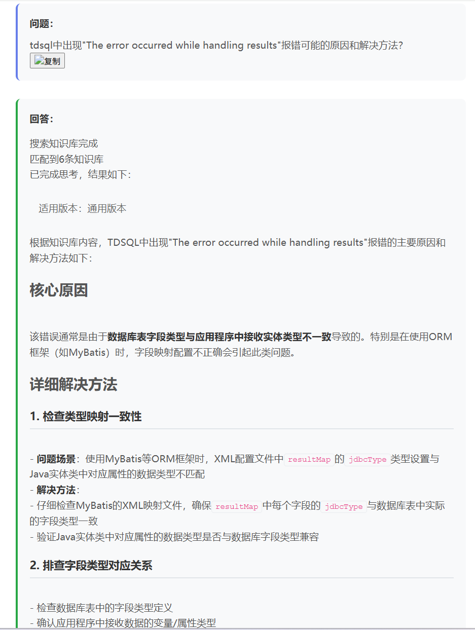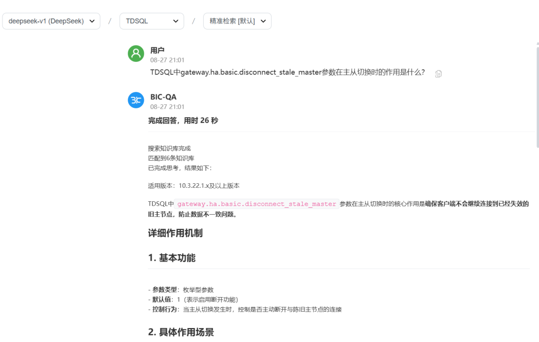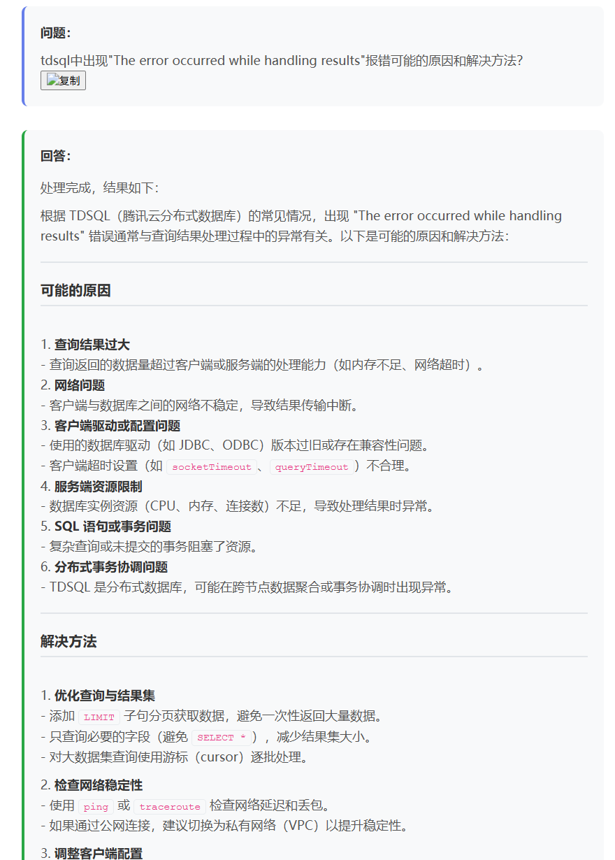 在DTCC期间,腾讯云数据库团队与佰晟智算两个深圳的团队在北京完成了一次异地交流,大家达成的一项合作就是共建国产数据库知识库。从DTCC回来后,腾讯云数据库的同学就十分积极地与我们开始了协同工作,将目前TDSQL最新的文档资料整理后交给佰晟智算进行处理。今天这项合作的第一个成果已经上线了,在BIC-QA的官方网站上已经上线了第一个TDSQL知识库-TDSQL官方文档知识问答。 因为在BIC-QA中已经预留了TDSQL的编码-2201,因此目前在使用BIC-QA 1.0.6版本的用户无需任何升级,就可以在知识库中选择TDSQL,然后对知识库发起提问了。 对于“出现"The error occurred while handling results"报错可能的原因和解决方法?”这个问题,如果选择了知识库,可以十分明确地找到TDSQL的官方答案,因为数据库表字段与应用程序中接收实体的类型不一致导致了这个问题,很可能是在ORM框架中配置存在问题导致了错误的发生。如果不使用知识库,直接问deepseek,结果则截然不同。 可以看出,直接询问deepseek,得到的回答是驴唇不对马嘴的。国产数据库的知识,目前在国内外大语言模型都比较缺乏,因此回答错误的概率很高,通过专业知识库去寻找答案还是十分有必要的。 针对这个问题,如果去问满血的 QWEN3,答案依然是错误的。我们再换一个问题:“gateway.ha.basic.disconnect_stale_master参数在主从切换时的作用?”,看看BIC-QA的效果如何: 命中了知识库,回答还是有理有据的。下面我们关闭知识库,仅用deepseek来回答这个问题: 很幸运,这回deepseek能够回答这个问题,不过从回答问题的细节与质量上看,使用了知识库的效果更好。从上面这两个例子可以看出,在使用完全相同的提示词的情况下,在知识库的帮助下,TDSQL知识问答的质量有了相当明显的提升。 目前我们已经开源了访问国产数据库知识库的代码,有兴趣的朋友可以去https://gitee.com/BIC-QA/bic-qa/releases/tag/v1.0.6 下载BIC-QA最新版的浏览器插件,安装在chrome内核的浏览器(比如EDGE等)中直接使用。也可以到https://gitee.com/BIC-QA/bic-qa 去下载源码,自己定制相关的版本。我们选择了比较宽松的APACHE协议,允许任何人去做裁剪和定制,甚至直接免费调用我们的API接口。 我们和腾讯云数据库的合作会继续深入,未来TDSQL的知识库也会陆续上新一些高质量的运维经验。目前API服务还是放在我们的服务器上,今后也可能会迁移到腾讯云上去,更好地为大家提供服务。
