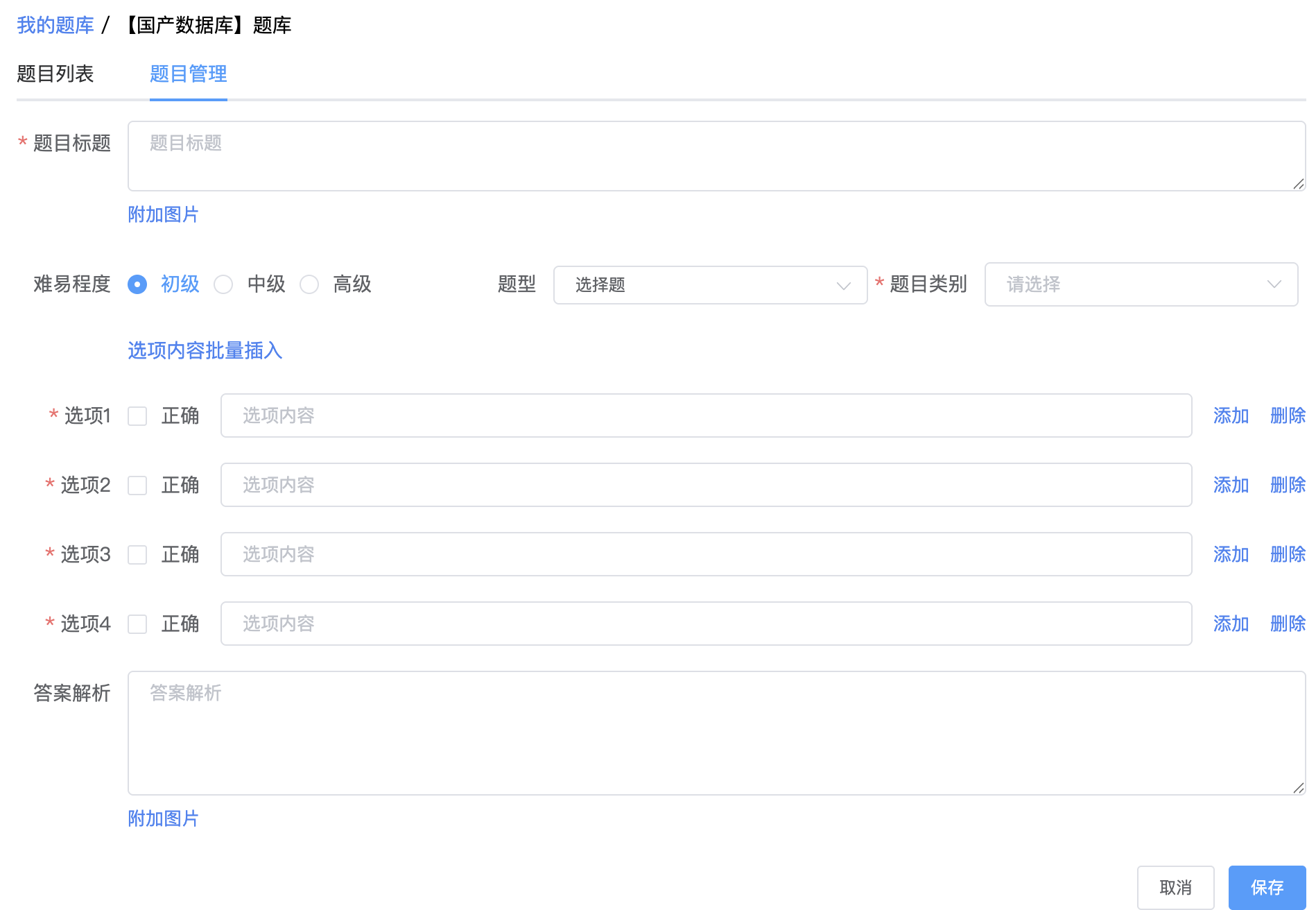 - 选择 “新增题库”,按照标准模板填写题目即可。