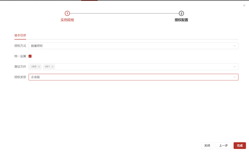 – 非云纳管实例时,授权方式选择数量授权后,保存即可,不需要勾选【统一设置】,也不需要上传激活文件。