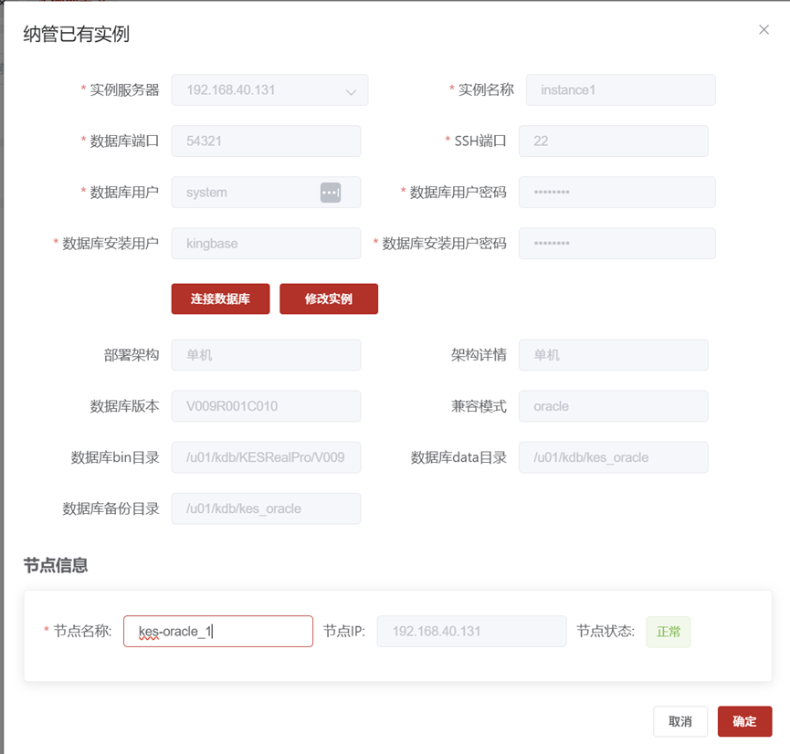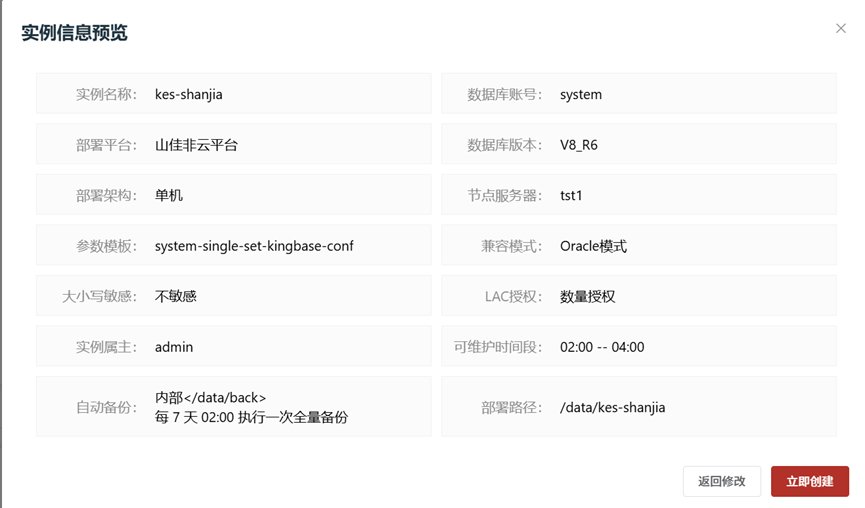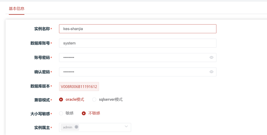 输入实例名称,默认根填充为[kes+日期],输入数据库账号,默认为[system],【账号密码】和【确认密码】需统一,数据库版本默认V8_R6。