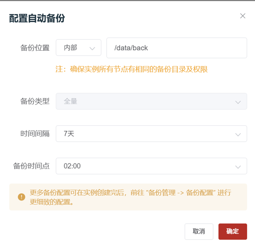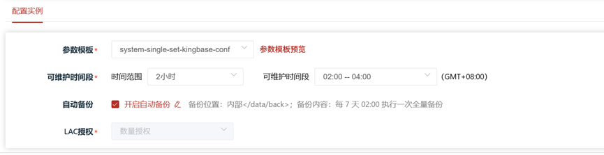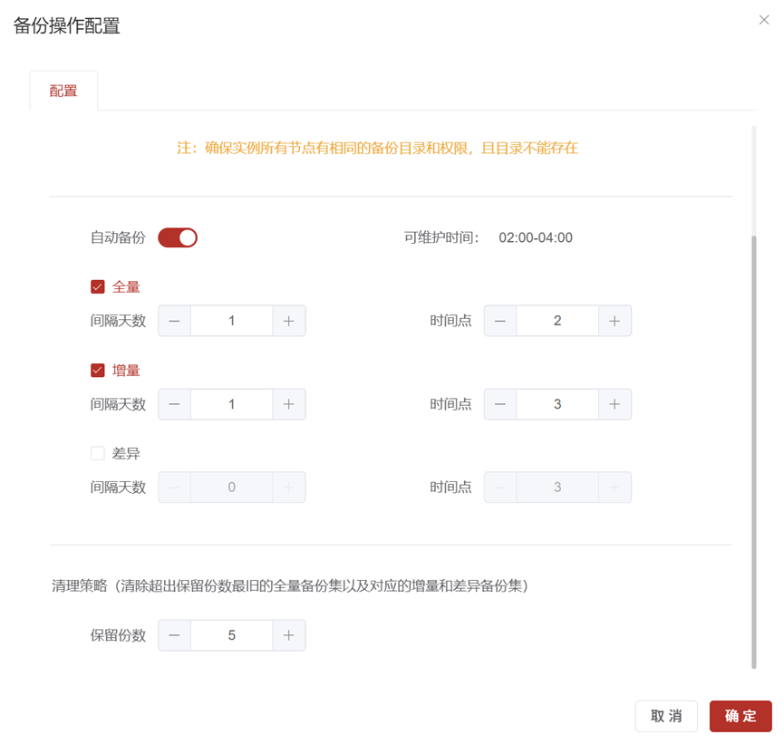 可维护时间段:使用时间范围设置具体的可维护时间段,系统将在可维护时间段内进行备份等操作。