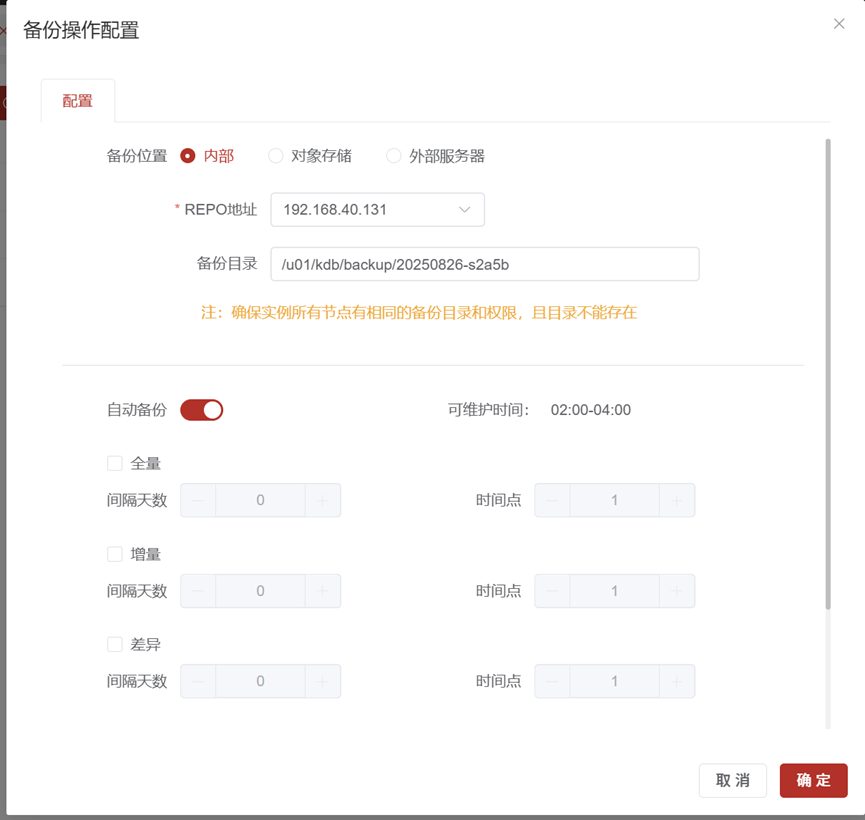 注意:使用云对象存储时,必须保证云对象服务器和数据库节点服务器时间一致,如果时间不一致,备份时会报错