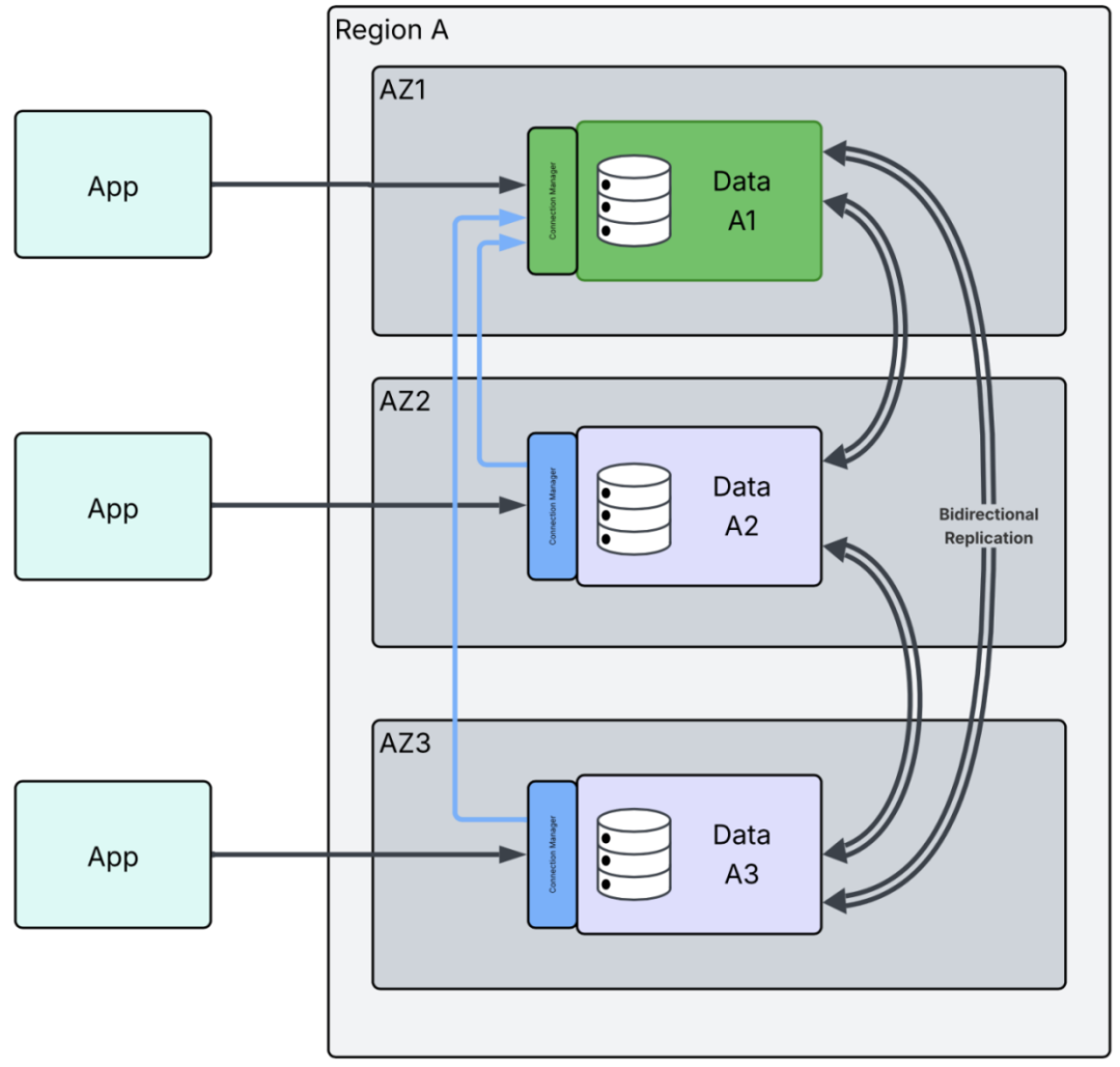 在此图中,可以看到通过连接管理器端口连接到 PGD 群集的应用程序。连接管理器负责将读写事务路由到组中的相应节点。写入领导者负责处理所有写入事务,并在 AZ1 的顶部以绿色显示。