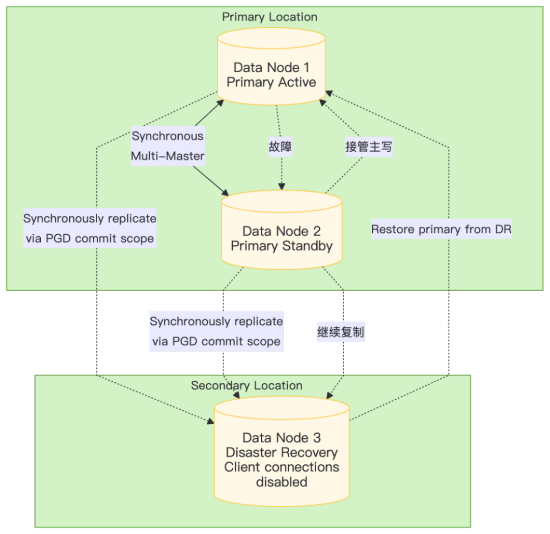 使用 PGD 提交范围,主位置中的数据节点配置为将数据同步复制到主位置中的另一个节点和辅助位置中的节点。这可确保数据在提交到主位置之前复制到所有节点。在节点宕机的情况下,提交范围规则会检测情况并将复制降级为异步复制。此行为允许系统继续运行。