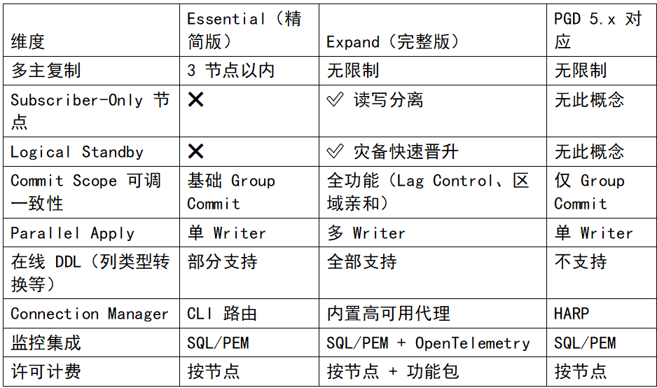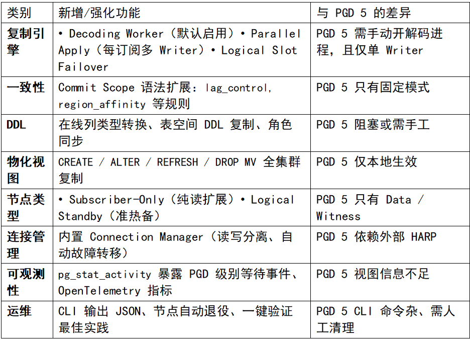 PGD6相比PGD5带来很多新特征及功能提升,而且PGD 6还分出两个版本,应对不同的业务需求和场景。下表简单归纳一下这些对比。