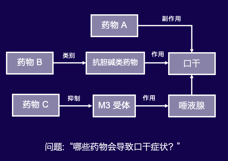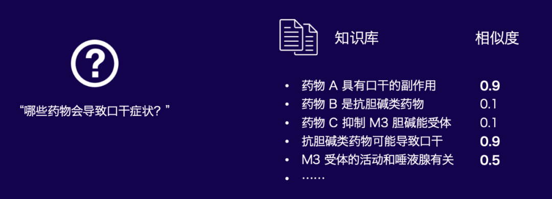 以“哪些药物会导致口干”为例,RAG 通过文本相似性识别关键词(如“药物”“口干”)及相关概念,知识库中第 4 条和第 1 条因词汇重合度高(如“口干”)被关联,RAG 可胜任。但 RAG 无法进行推理,例如第 2 条提到药物 B 为抗胆碱类药物,与下文“抗胆碱药物可能导致口干”相关,人类可瞬时推导,而 RAG 基于相似度的局限性难以实现这一点。