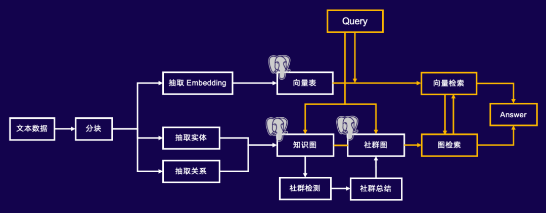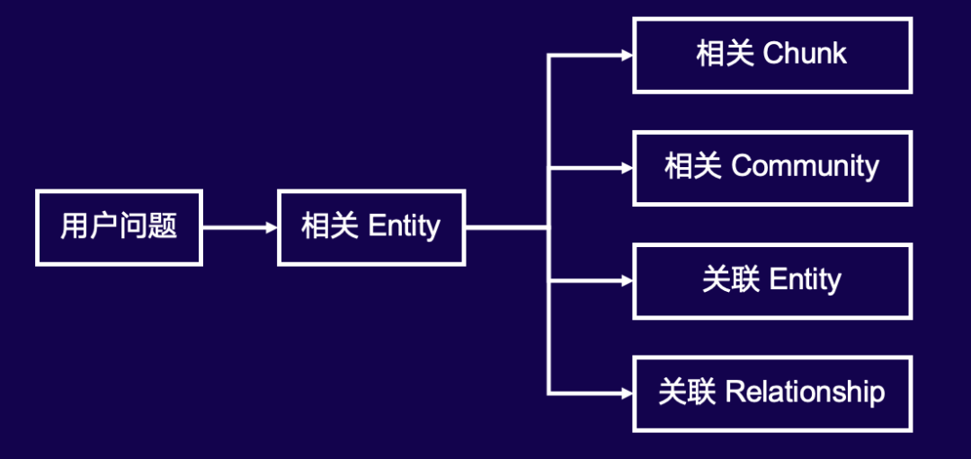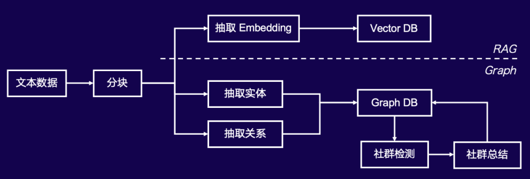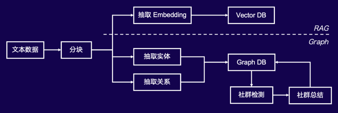 首先,将文本进行分块,Embedding,存入 Vector DB。接着,通过抽取实体和关系生成图,将图信息(包括节点、边及描述)存入 Graph DB,并将描述 Embedding 后存入 Vector DB。随后,运行 Community 检测算法,用 LLM 总结 Community 信息,再将结果 Embedding 存入第三张 Vector 表。