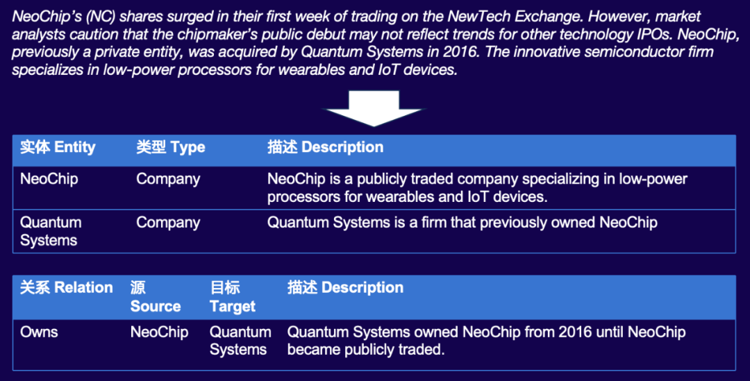 将一段关于公司及其收购行为和活动的描述输入大语言模型,并提供合适的提示后,模型能输出实体(点,如公司)和关系(边,如收购),并按要求的字段(如标题、类型、描述)格式化。这些数据随后可结构化地存入 Graph DB 中。