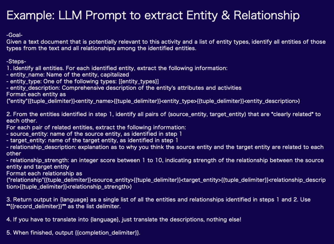 在 Graph 系统中,许多任务依赖 LLM 完成,以上就是来自微软 GraphRAG 项目中抽取实体和关系所用到的 Prompt。没有 LLM,图的抽取过程将难以处理,这也是历史上知识图谱项目未获广泛关注的原因——其抽取过于依赖人工。如今有了 LLM,构建过程变得轻松高效。