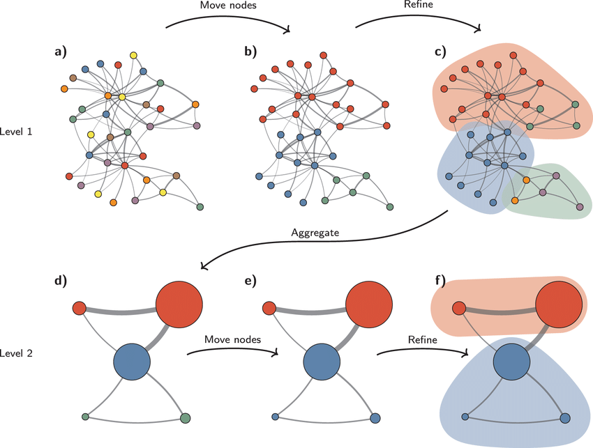 第三步是 Graph 特有的有趣过程,涉及社群(Community)概念。社群是指在图(由点和边构成)中,某些点之间的连接较为密集,类似社交网络中小区居民频繁互动的特点,内部边多于外部边。