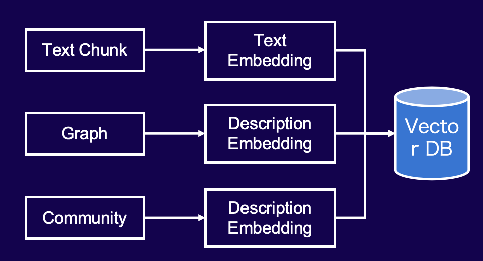 获取 Community 信息后,将其与原始图信息(包括点、边及描述)、二次处理的 Community 信息以及原始 Text Chunk 一并存入 Vector DB,可简单视为三张表。