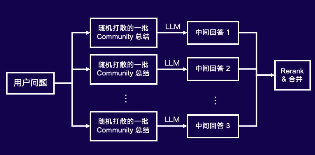 Global Search 适用于整体性问题而非单一概念,例如"总结数据中的 5 个主要主题"或"近年的活跃科研项目"。这种全局理解对专家系统尤为重要,单纯依靠零散文本难以由 LLM 直接获取。为此,利用 Community 概念,通过随机分组处理:每次取 20 个 Community 总结(因超 20 可能超出 LLM 上下文或遗忘问题)输入 LLM 生成中间回答,循环遍历所有 Community。