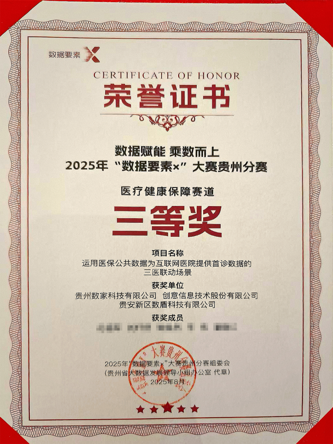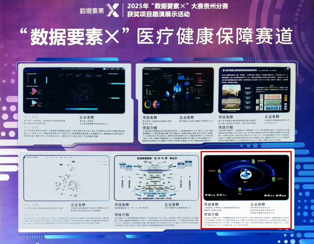 在数博会2025年“数据要素×”大赛贵州分赛获奖项目路演展示活动中,创意信息联合贵州数家科技有限公司、贵安新区数盾科技有限公司,凭借《运用医保公共数据为互联网医院提供首诊数据的三医联动场景》项目,从12个赛道、184个入围项目中脱颖而出,荣获医疗健康保障赛道三等奖。