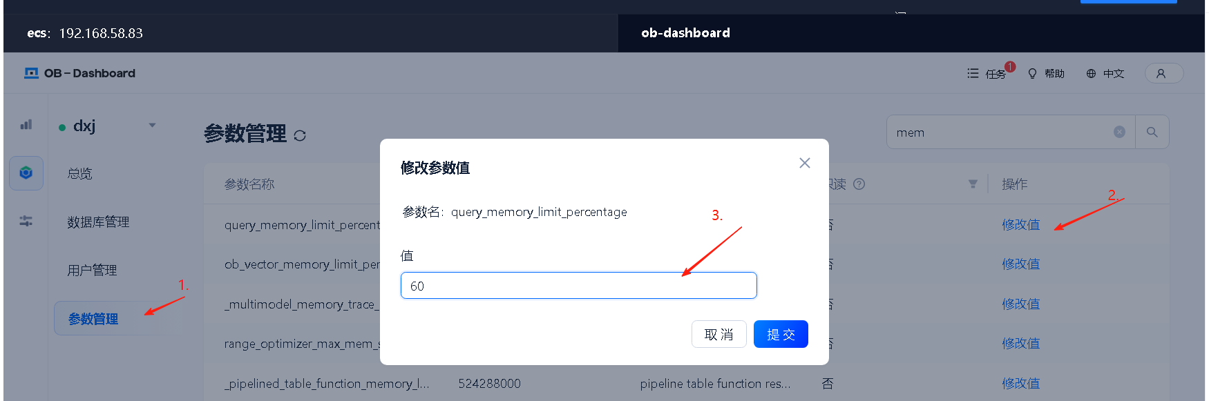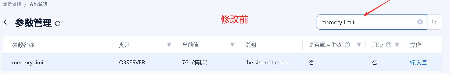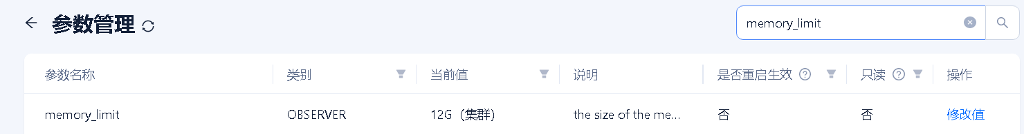 要求:点击参数管理按钮进入集群参数管理页面,可以搜索参数并对其进行修改,以内存相关参数为例,首先搜索关键字 memory,注意两个关键参数的值 memory_limit 为7G,system_memory 为 1G,我们可以尝试将 memory_limit 的值修改为 12G。