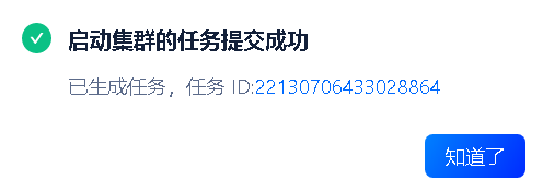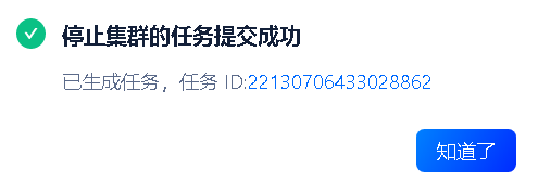 集群正常运行状态下,点击停止集群,再点击确认框的停止按钮会发起停止集群的任务,点击弹框中的任务 ID 进入任务页面,可以查看停止集群的任务详情。