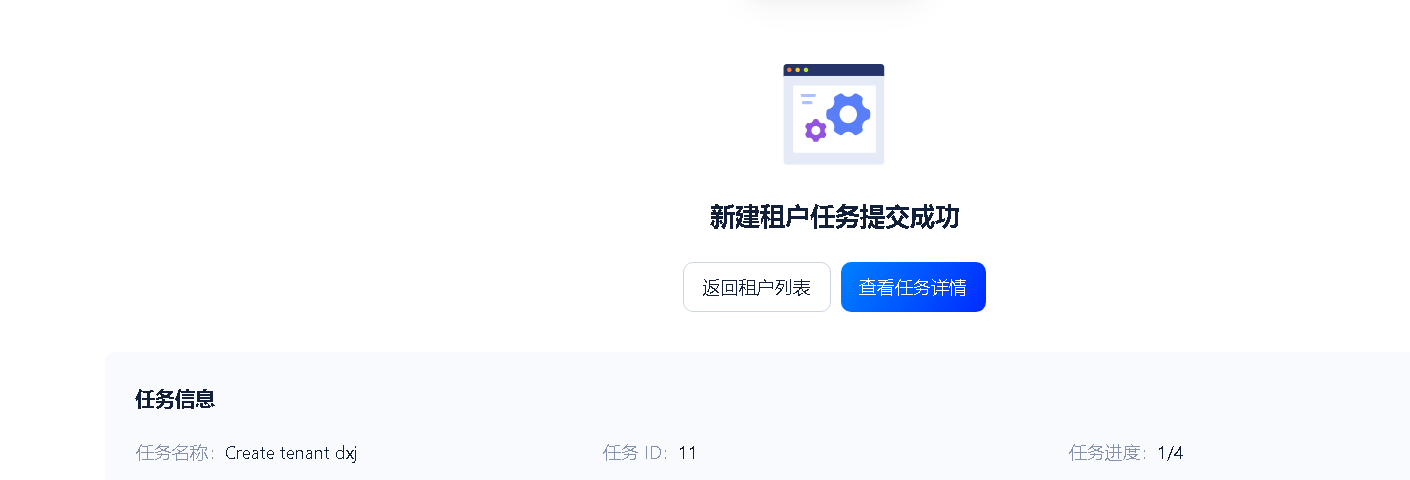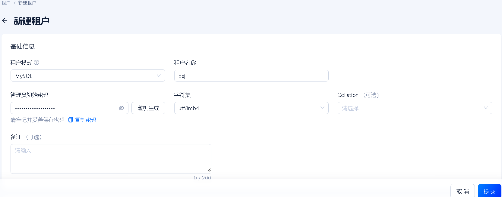 点击租户管理页面中的新建租户按钮,进入新建租户页面,填入租户的基本信息并点击提交按钮,之后会发起创建租户的任务。