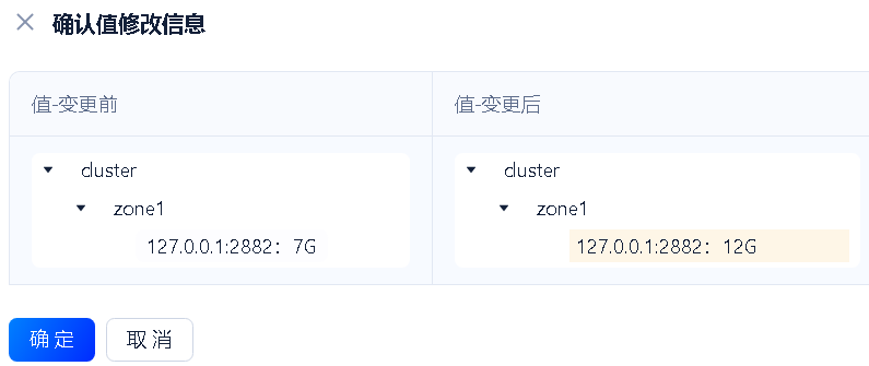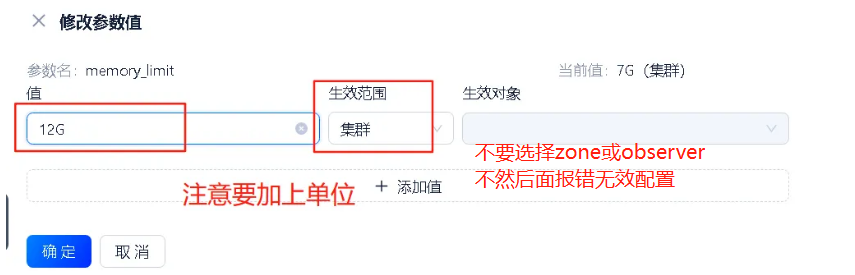 点击 memory_limit 后的修改值,填入 12G 生效范围选择集群,点击确定,确认修改信息后再点击确定完成修改。