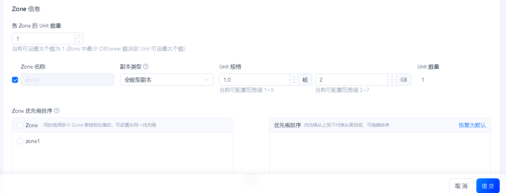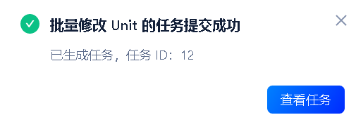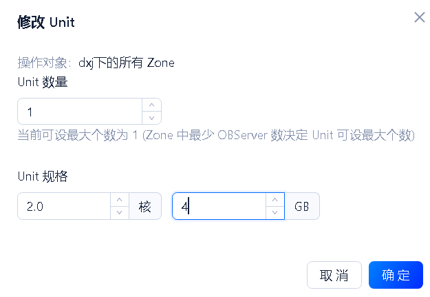 租户的资源由 unit 定义,点击修改 unit 按钮,调整 unit 规格后点击确定将发起修改 unit 的任务,等待任务成功后 unit 即修改成功