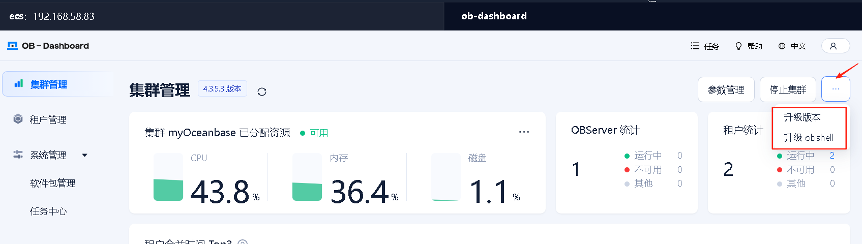 目前 OB-Dashboard 上还提供了升级集群和升级 obshell 的功能,这两个功能需要上传对应的软件包,之后可以发起升级的任务。