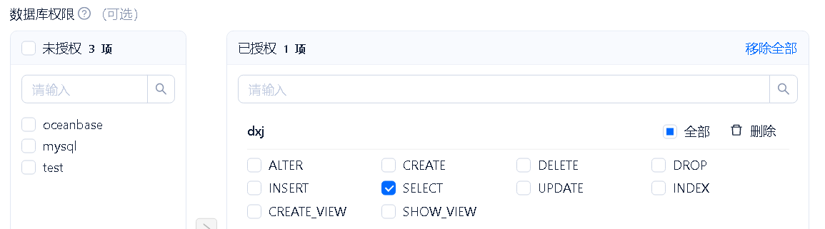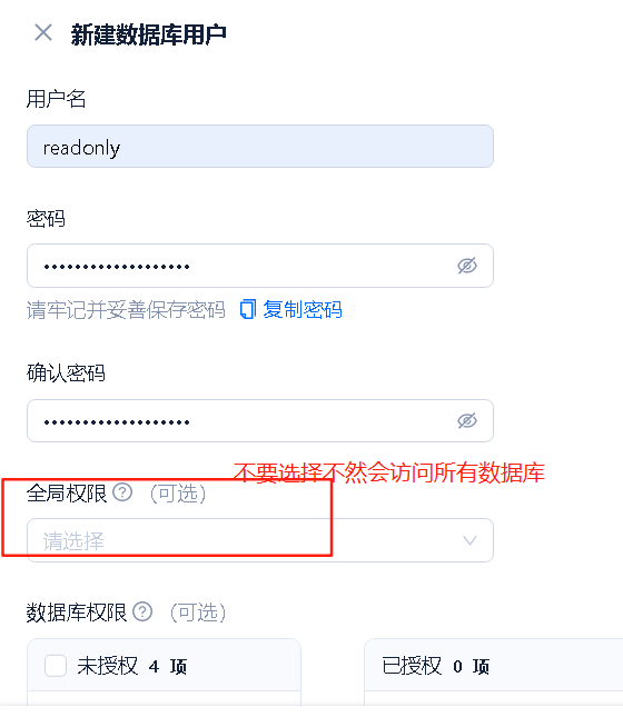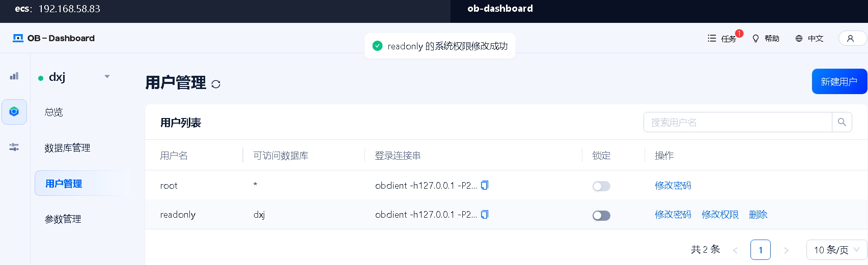 点击用户管理页面的新建用户按钮,填写用户名,密码并选择相应的权限后点击提交,即可创建一个用户,例如创建一个 readonly 用户并赋予 dxj 数据库的 select 权限。