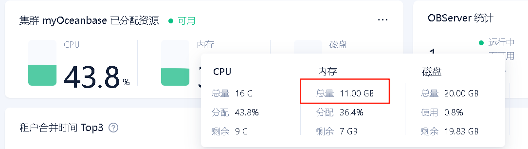 回到首页,鼠标移动到集群已分配资源部分,查看集群的资源信息可以看到内存总量已经变成 11G, 这里的总量指的是可以分配给租户的内存大小,计算方式是 memory_limit - system_memory 得到的结果和修改后的参数匹配。