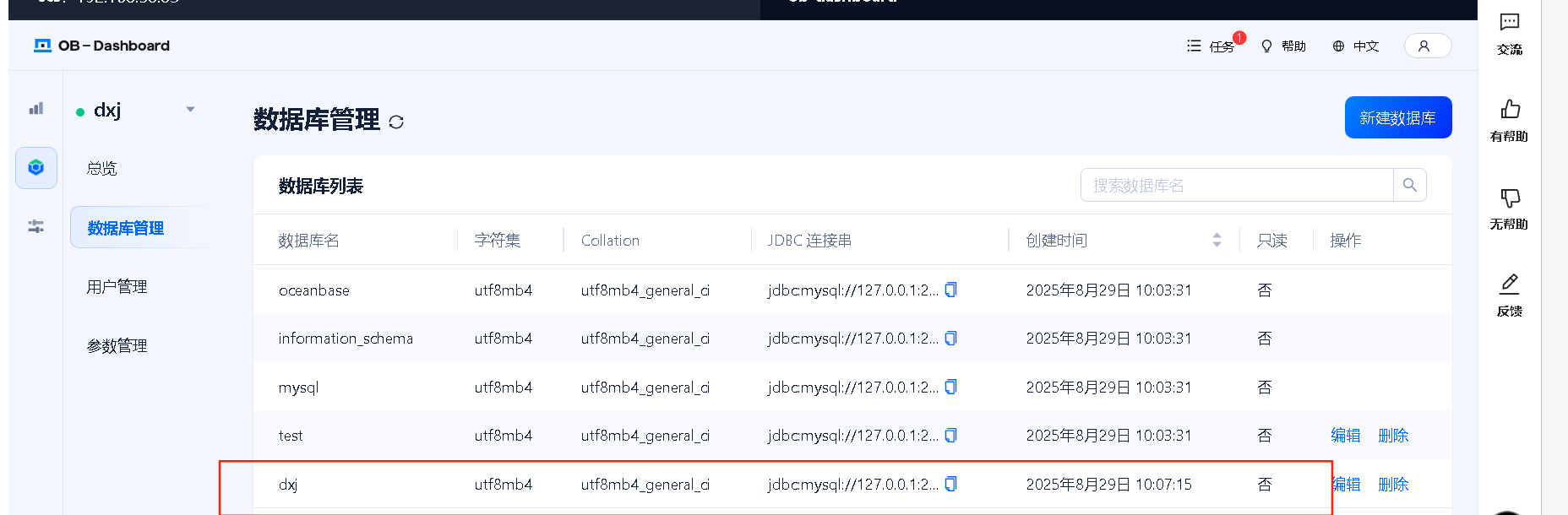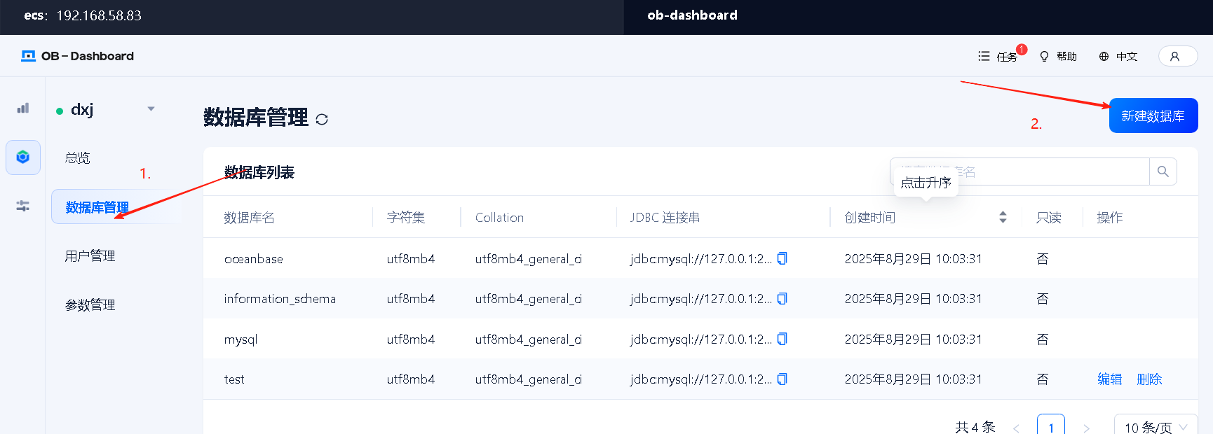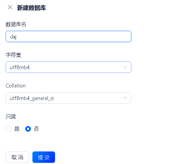 点击数据库管理页面的新建数据库按钮,填写数据库信息后点击提交即可创建出对应的数据库。