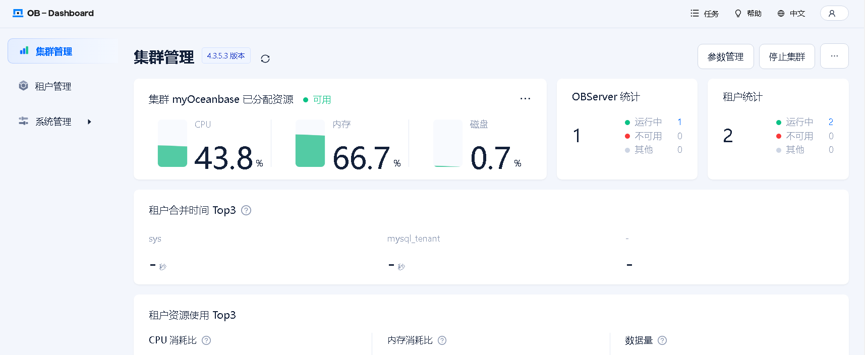 OB-Dashboard 首页展示了当前 OceanBase 集群的基本信息,包括资源分配和使用情况,集群拓扑,合并信息等,用户可以通过首页简单直观的获取集群的状态信息。
