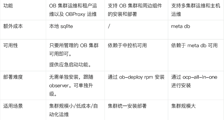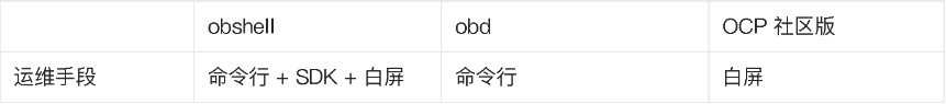 传统以 OCP 为中心,一体化管理和维护 OceanBase 的方式对于社区开发者和中小客户而言,管理成本高,平台依赖性强,并且缺乏在 OCP 故障不可用时的兜底管理方案。此外,国内外的数据库厂大多有原厂开发的黑屏命令行管理工具,而 OceanBase 现有的黑屏工具,如obd、ob_admin 等,目前还处于在诸如像社区开源、交付运维这样的独立场景应用,未完全推向用户侧。因独立发展的关系,安装及使用方式各异,暂未从整体上形成对外统一方案,很难为客户输出更大的价值。