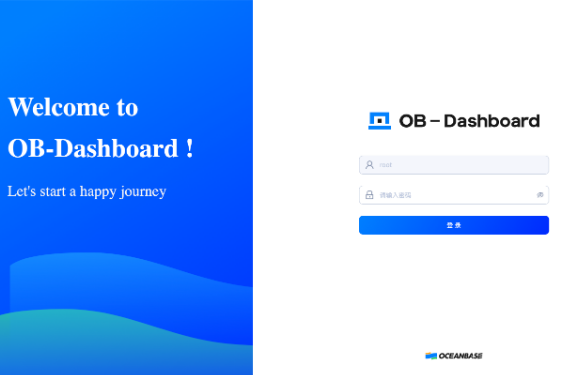 OB-Dashboard 使用 OceanBase 的账号体系进行鉴权,登录页面输入 root 账号的密码即可完成登录,如 root 账号密码为空可以直接点击登录。