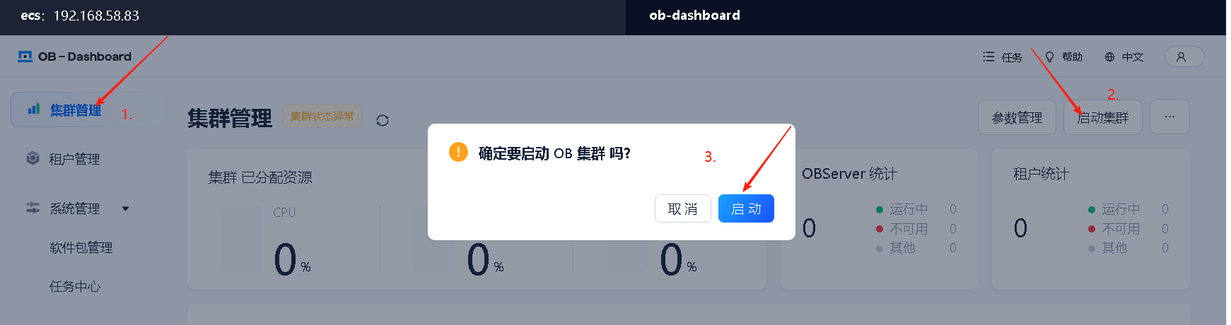 任务成功后回到首页,可以看到集群处于异常状态,同时各种统计信息为空,点击启动集群按钮,再次点击弹框中的启动按钮,会发起启动集群的任务,同样可以通过任务 ID 查看启动集群的任务详情,集群正常启动后首页信息恢复展示。