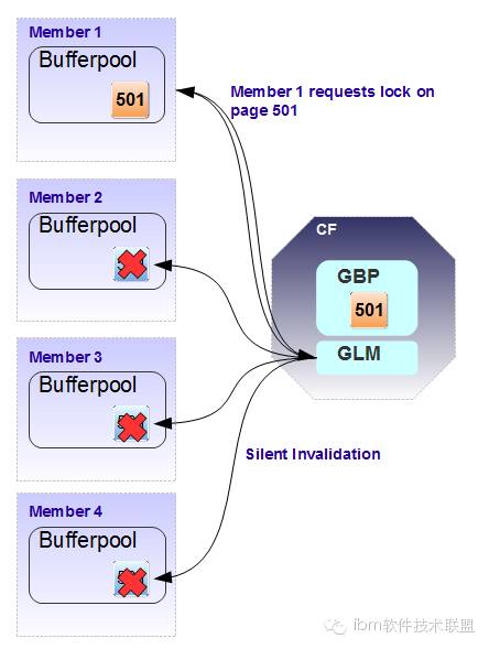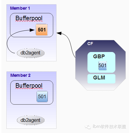上图所示,在member 1上有个应用想要访问page 501里面的数据,这个时候member 1的本地缓冲池并没有这个数据,但是CF的全局缓冲池里面是有的。那么Member 1就会通过RDMA的方式直接访问CF获取这个数据,并放置到本地缓冲池中。在上面这个例子中,如果CF的全局缓冲池没有page 501,那么member 1需要从本次磁盘读取。因为RDMA是直接物理访问对方内存,比从本地磁盘读取还要快很多。所以如果需要访问的数据能在全局缓冲池里找到,那么访问的性能会更好。