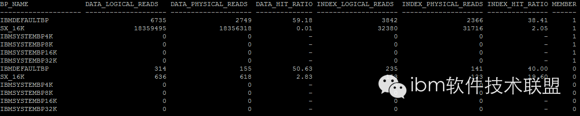 使用db2命令运行上面的语句,会得到所有缓冲池有关GBP的命中率。