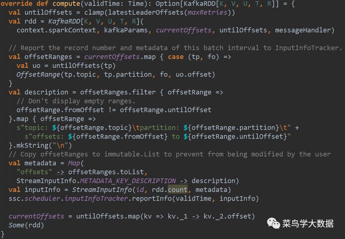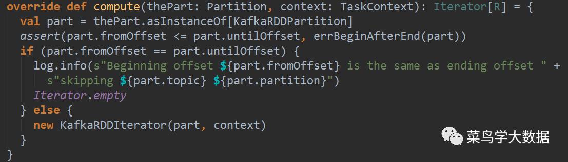 重点是这里的compute函数,创建了KafkaRDDIterator实例。用该实例来真正pull数据。代码如下: